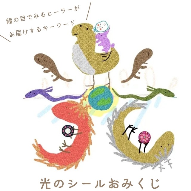 \光が舞い降りるおみくじシール/ 龍、オオサンショウウオ、ヘビ、 黄金の鳥、うさぎ⋯ たくさんのいのちが 光を届けます✨ 心の中の願いを、 光の力で後押し✨ ・・・・・・・・・・ 気軽に占えるシール型のおみくじ。 どんな言葉が巡ってくるのか、 引くたびにドキドキが広がります。 おみくじの言葉は、 宇宙と地球のコア(中心)から 届いたものです✨ シール本体は 水の神様のいる神社にて、 整えられております✨ それを手に取ることで、 目の前の選択肢が クリアに見えてくるかも!? シールの使い方はあなた次第。 ノートや手帳、 自分の持ち物に貼って 光を集めていただくのも おすすめです✨ シールには35種類の言葉のうち ひとつが書かれています。 1〜35の中で お好きな数字を選んでいただき、 その番号のおみくじを ご自宅にお送りいたします✨ どんな言葉が届くかな〜という お楽しみ感もあります✨ ■ 商品の内容 ・光のおみくじシール1枚 (5枚まで購入可) ・神社さま、お寺さまに 置いていただく場合は 105枚での販売も可能です。 ご相談ください。 ■ サイズ シール部分 50mm×50mm (手のひらサイズ) ■ 素材 普通紙(上質紙)、ラミネートなし ■ 取り扱い注意事項 直射日光や高温多湿の場所は 避けて保管してください。 防水ではありません。 シールは一度貼ったあとに剥がすと 粘着力が弱くなる場合が ありますのでご注意ください。 ■ 発送・注文に関する情報や注意事項 ・ご注文はオンラインショップから承ります。 通常、5営業日以内に発送予定です。 ・在庫状況によりお届けまで14日程度 お時間をいただく場合がございますので、 その際はご了承ください。 ■ その他の情報や注意事項 ・シールデザインや色合いについては、 製造ロットにより若干の違いが 生じることがあります。 ・ご不明点がある場合は、 お気軽にお問い合わせください。 ・おみくじの結果は、 未来を保証するものではありません。 龍ヒーラーが作る 光のシールおみくじ✨ お買い求めは ショップのお問い合わせからどうぞ。